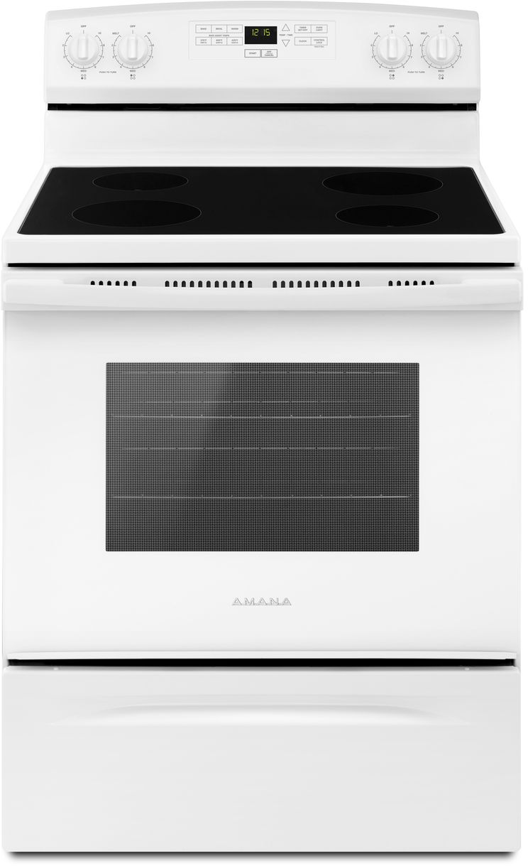 This 30-inch Amana® Electric Range comes with Bake Assist Temps to help you get dinner going. Simply choose a preset temperature setting to get started. Or set your bake or broil temperatures with Easy Touch Electronic Controls Plus, which are extra-large and easy-to-read. And when you need to know how your dinner is doing without opening the oven door, the Extra-Large Oven Window lets you see and savor.