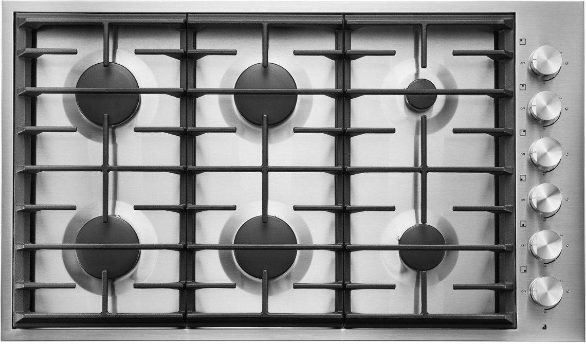 With a combined 78,000 BTUs of power, this luxury JennAir® gas cooktop is an exceptionally robust six-burner, 36-inch cooktop. Its Simmer/Melt Burner reaches as low as 800 BTU, while an extremely low profile allows for near-flush countertop installation.Read More